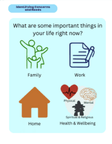 Talk through questions, concerns, and fears. | To identify specific questions, concerns, and fears that may impact the person’s care journey. |