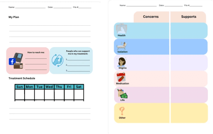 Identify challenges and offer supports to make treatment easier. | Identify changes to the treatment plan and schedule. | |