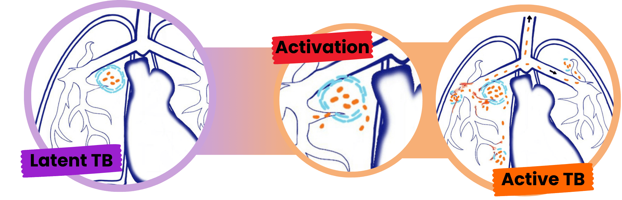This is how the 'sleeping' TB germ (Latent TB) ‘wakes up’ (Activation) and causes disease (Active TB).