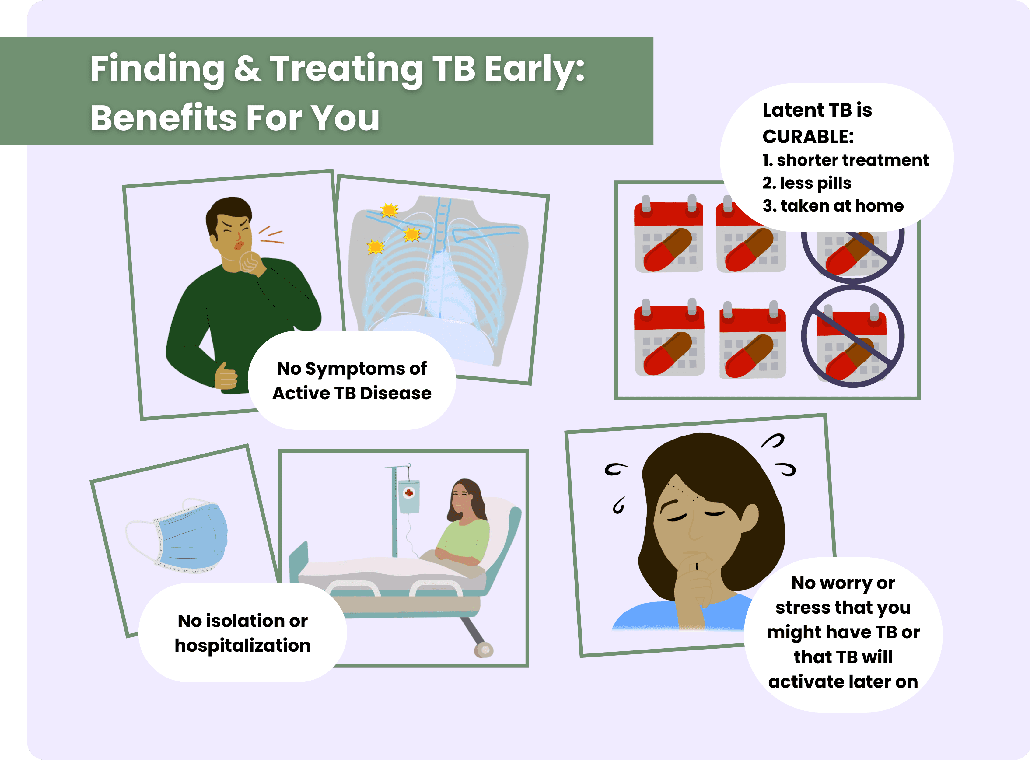 The earlier we find TB in the body usually means a shorter treatment with less pills. If it’s only in the Latent stage, you would even be taking your antibiotics at home rather than coming into the clinic.
